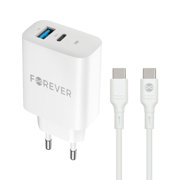 Forever TC-07-30AC PD QC charger 1x USB-C 1x USB 30W white + USB-C – USB-C cable 60W